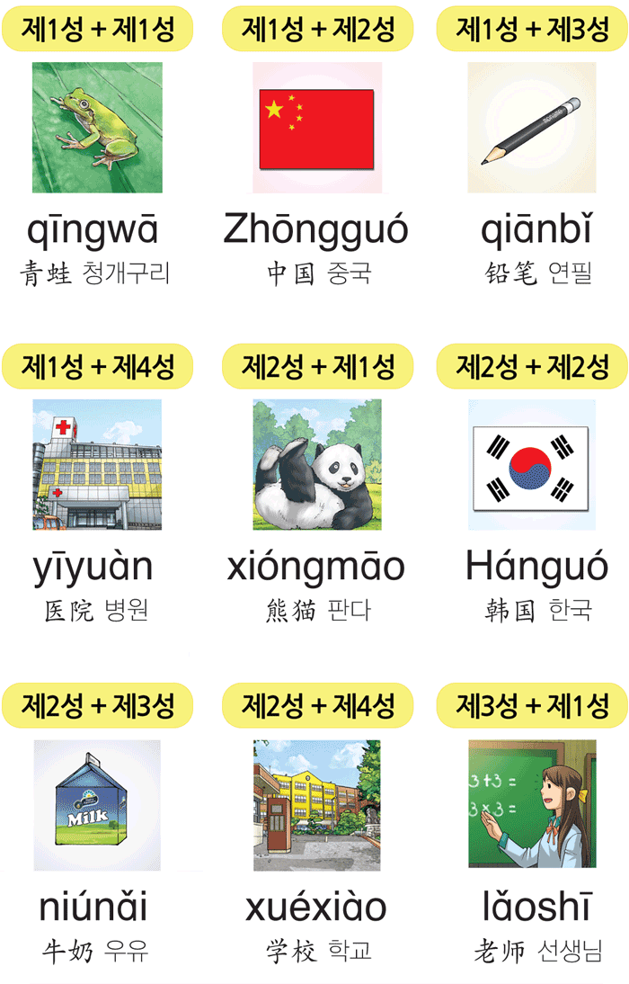 성모와 운모가 결합하고 운모에 성조가 더해져 하나의 중국어 음절이 됩니다. 녹음을 따라 큰 소리로 읽으며 연습해 보세요.